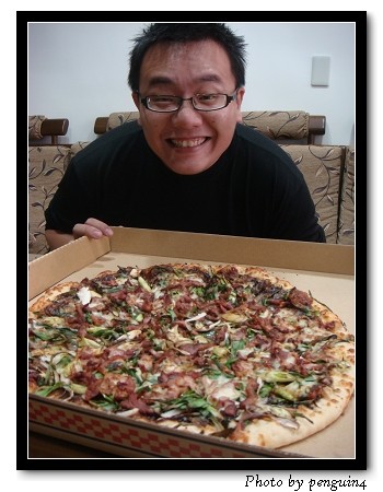 一個18"的披薩在極短的時間內 被三隻豬仔給掃完5/6 超極飽 滿到喉嚨了呢